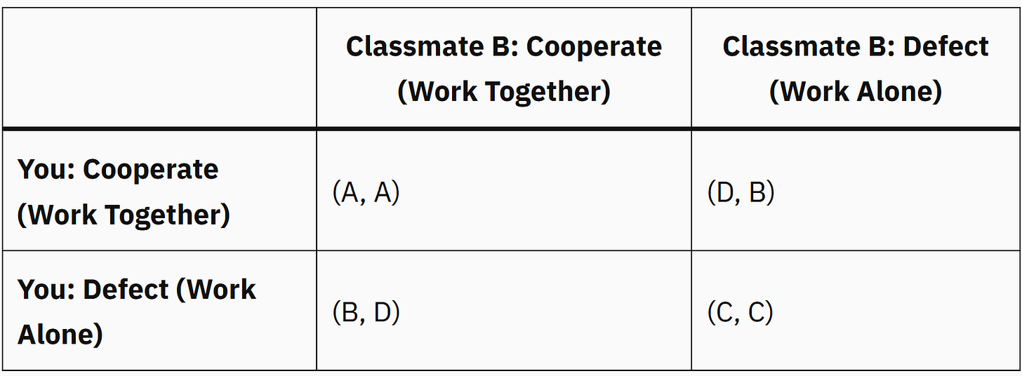 This morning I was reading Dr. A’s Substack about a Prisoner’s Dilemma with regards to the current US vs Iran Conflict. Pop culture sets this as two criminals sitting in opposite interrogation rooms with only the police having specific knowledge of what actions occur independently in each of those rooms.